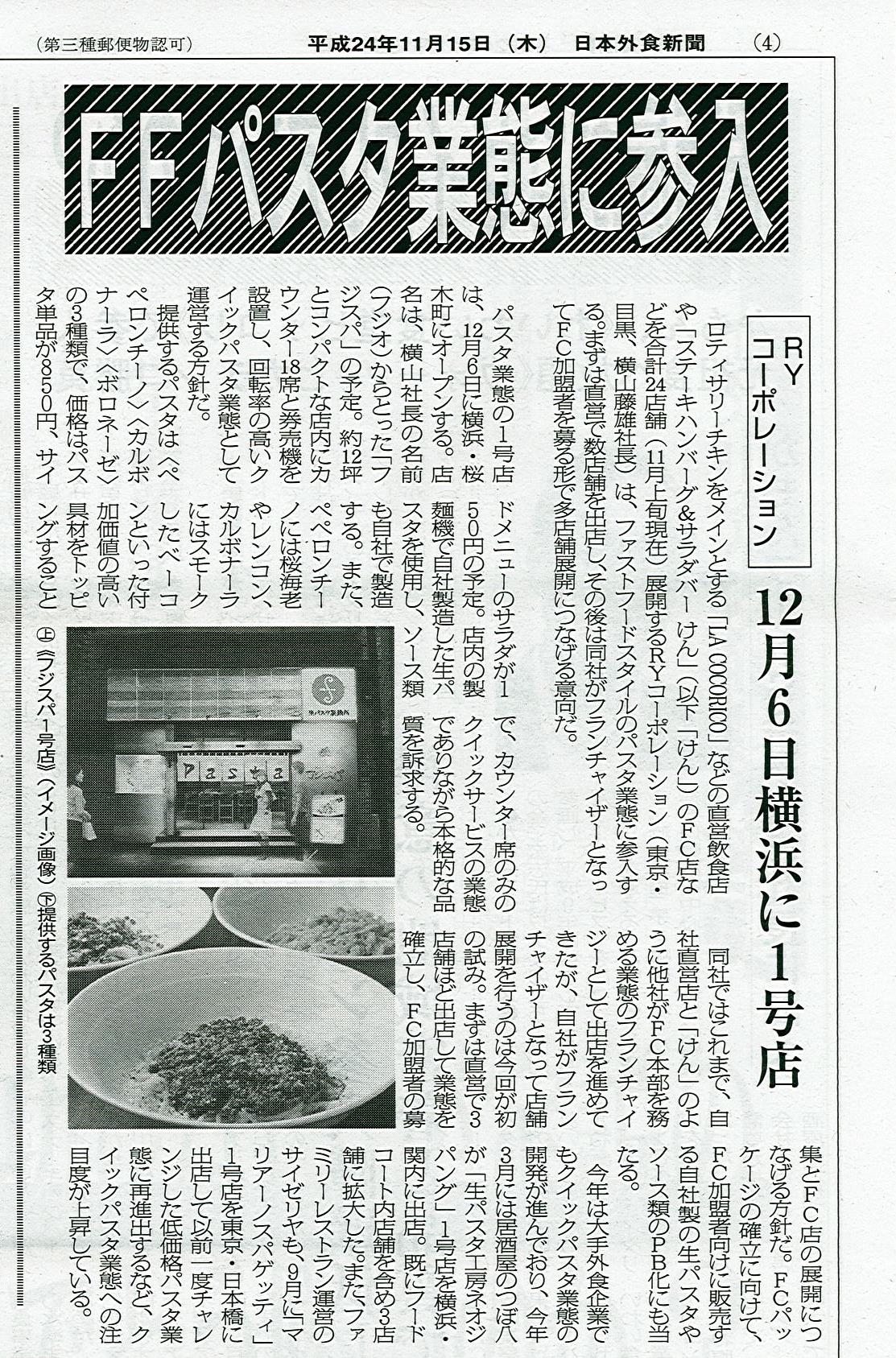 TOP Press Release 2012 2012年11月15日 :::2012年12月6日NEW OPEN!! ::: 生パスタ製麺所 フジスパ 横浜桜木町店が本日発刊の日本外食新聞に掲載されました。 2012年11月15日(木) 一覧ページへ戻る