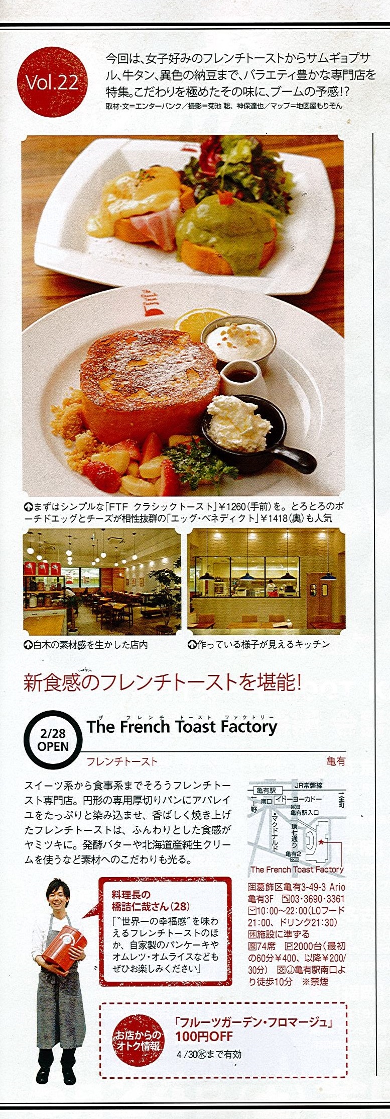 TOP Press Release 2014 2014年03月25日 東京ウォーカー(4/15発売)の新店舗特集にThe French Toast Factoryアリオ亀有店が紹介されました 2014年03月25日(火) 一覧ページへ戻る