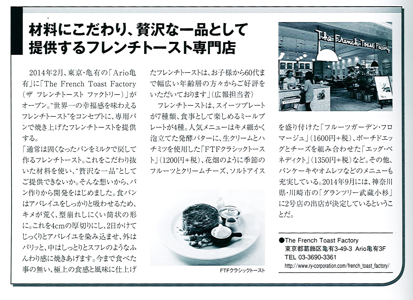 TOP Press Release 2014 2014年05月07日 GATEAUX(ガトー)[5/1発売]にThe French Toast Factoryアリオ亀有店が紹介されました 2014年05月07日(水) 一覧ページへ戻る