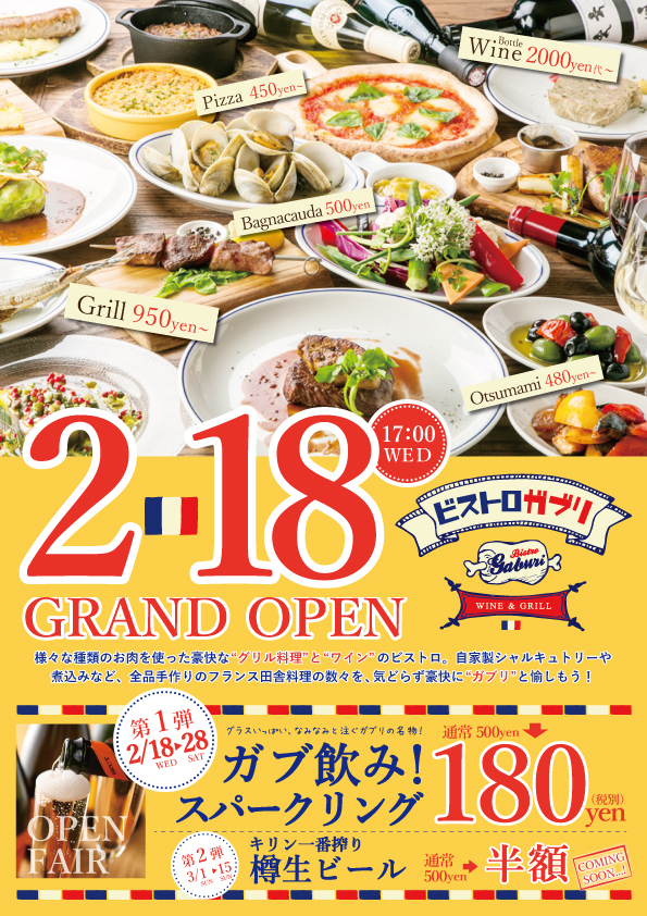 2月18日(水) 17:00より、ビストロガブリ初台店(FC店)がGRAND OPENいたします!