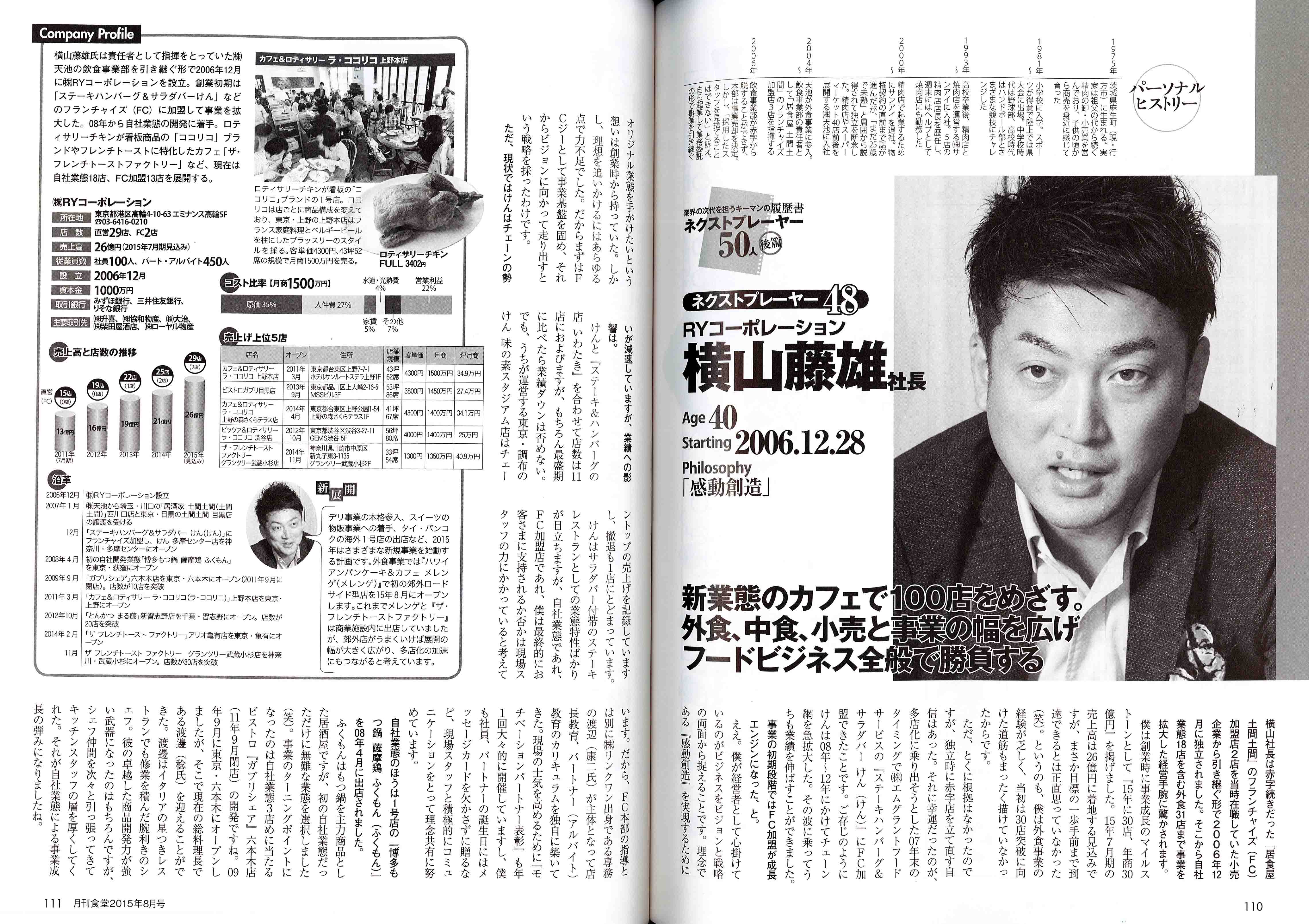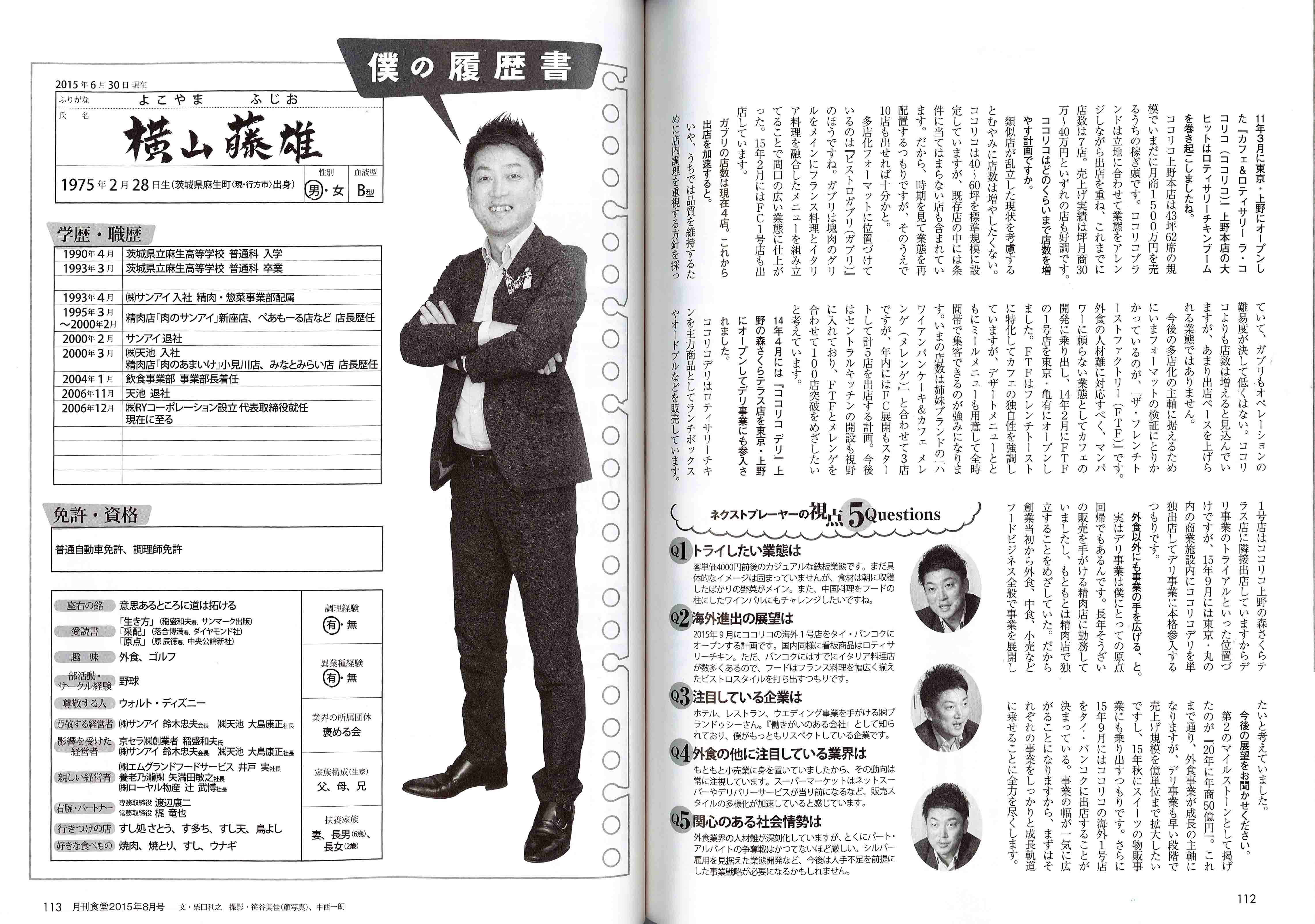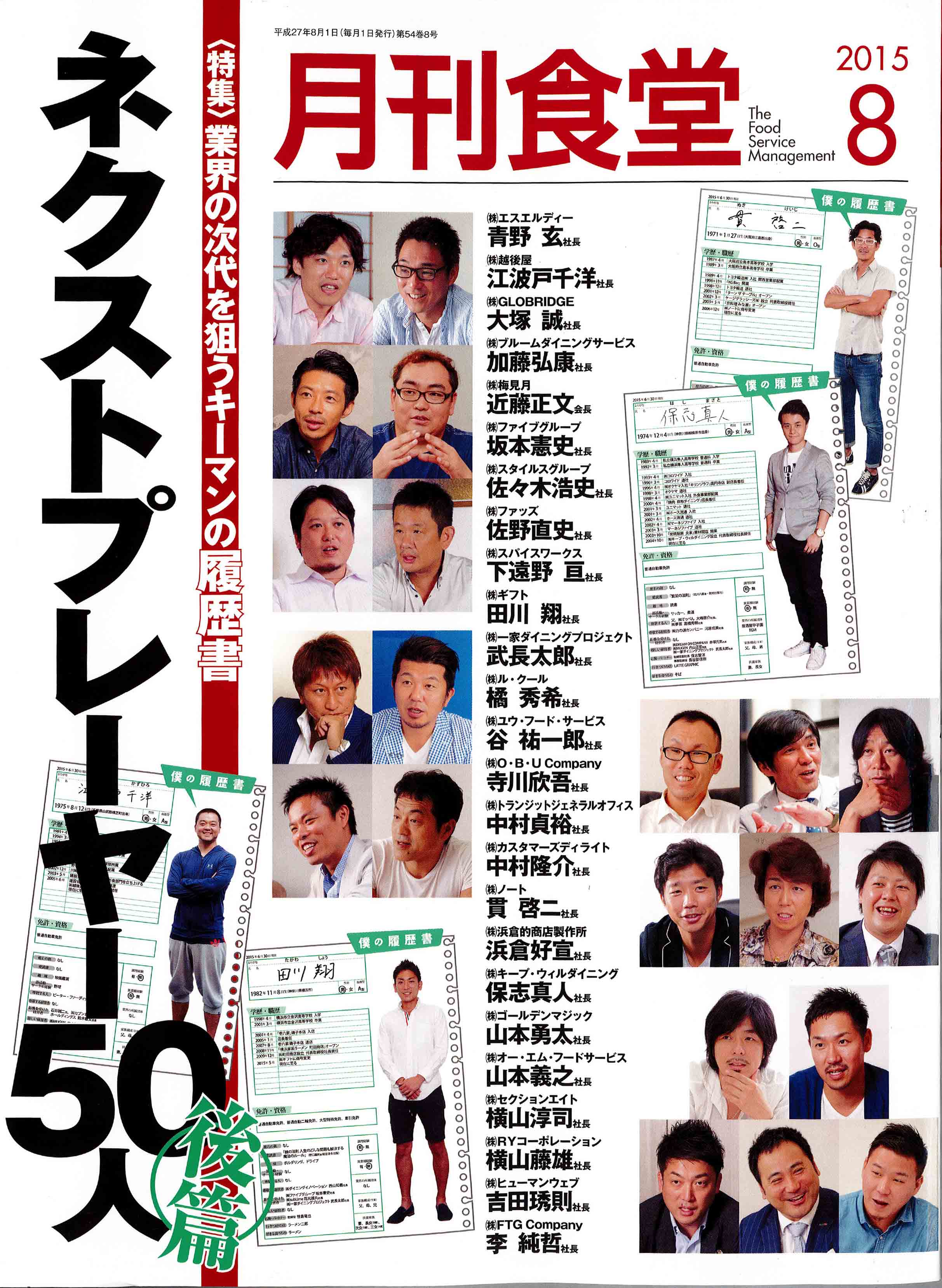 TOP Press Release 2015 2015年07月24日 月刊食堂8月号の「ネクストプレーヤー50人」に掲載されました。 2015年07月24日(金) 月刊食堂8月号の「ネクストプレーヤー50人」に代表取締役の横山が掲載されました。 一覧ページへ戻る
