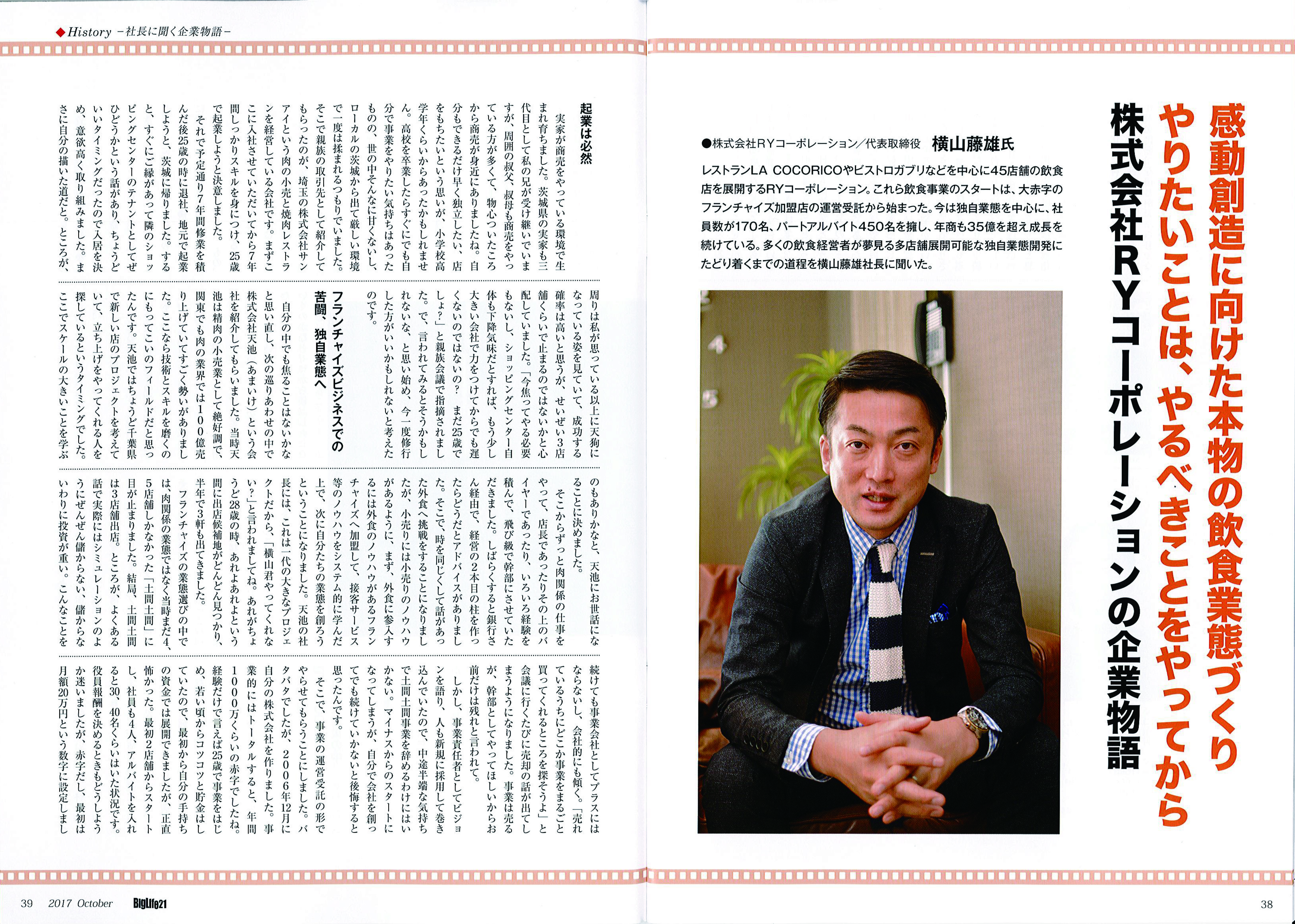 TOP Press Release 2017 2017年09月28日 「Big Life 21」10月号に横山社長のインタビューが掲載されました。 2017年09月28日(木) 2017年10月2日発刊「Big Life 21」10月号に横山社長のインタビューが掲載されました。 詳しくはこちらから 一覧ページへ戻る