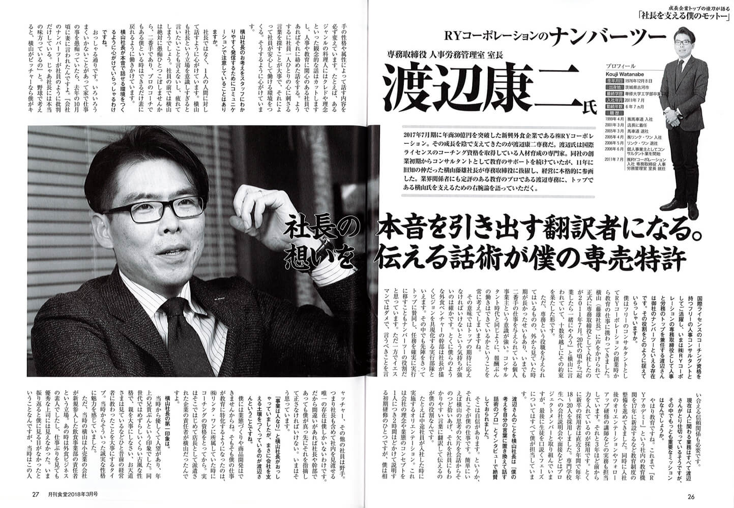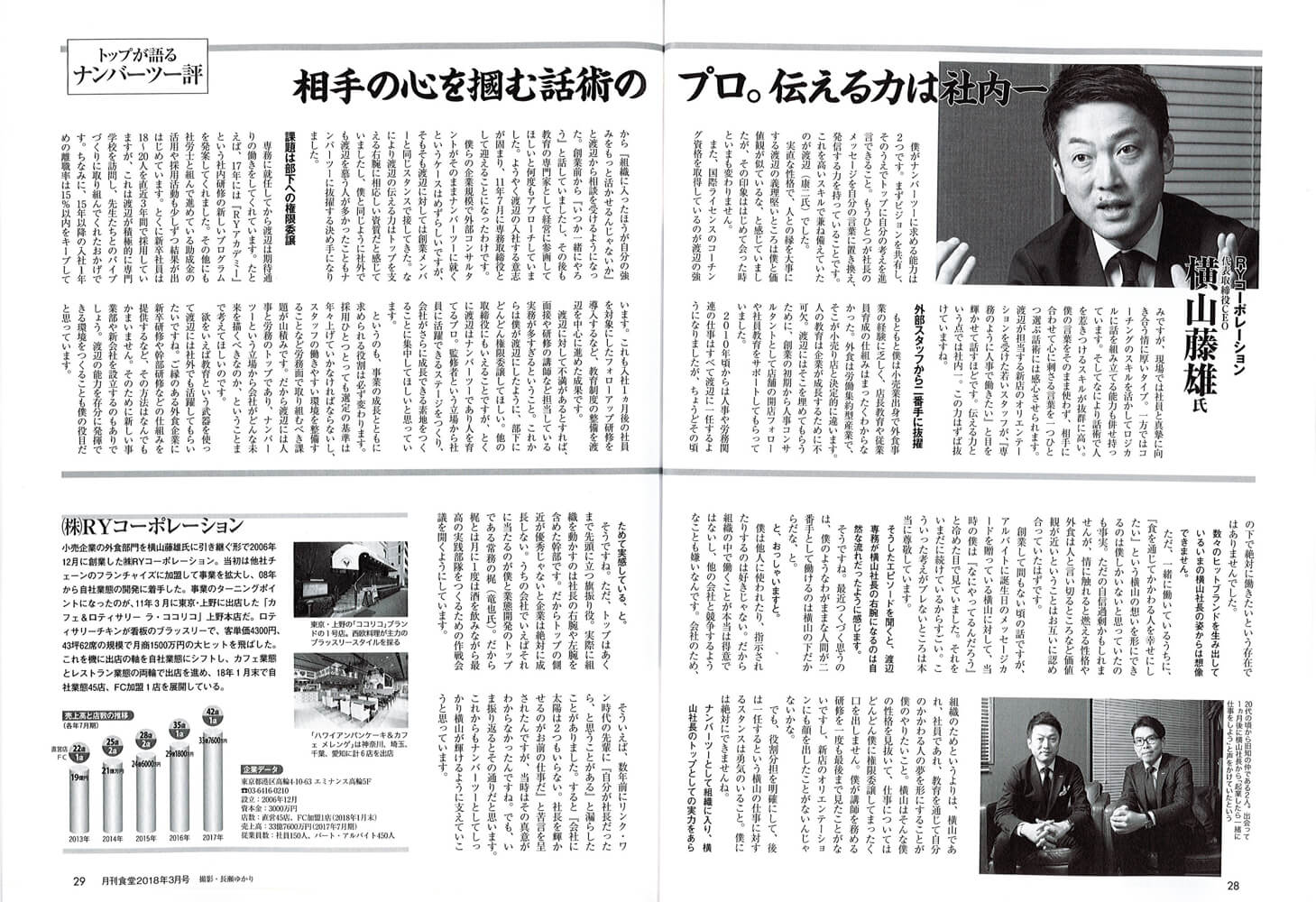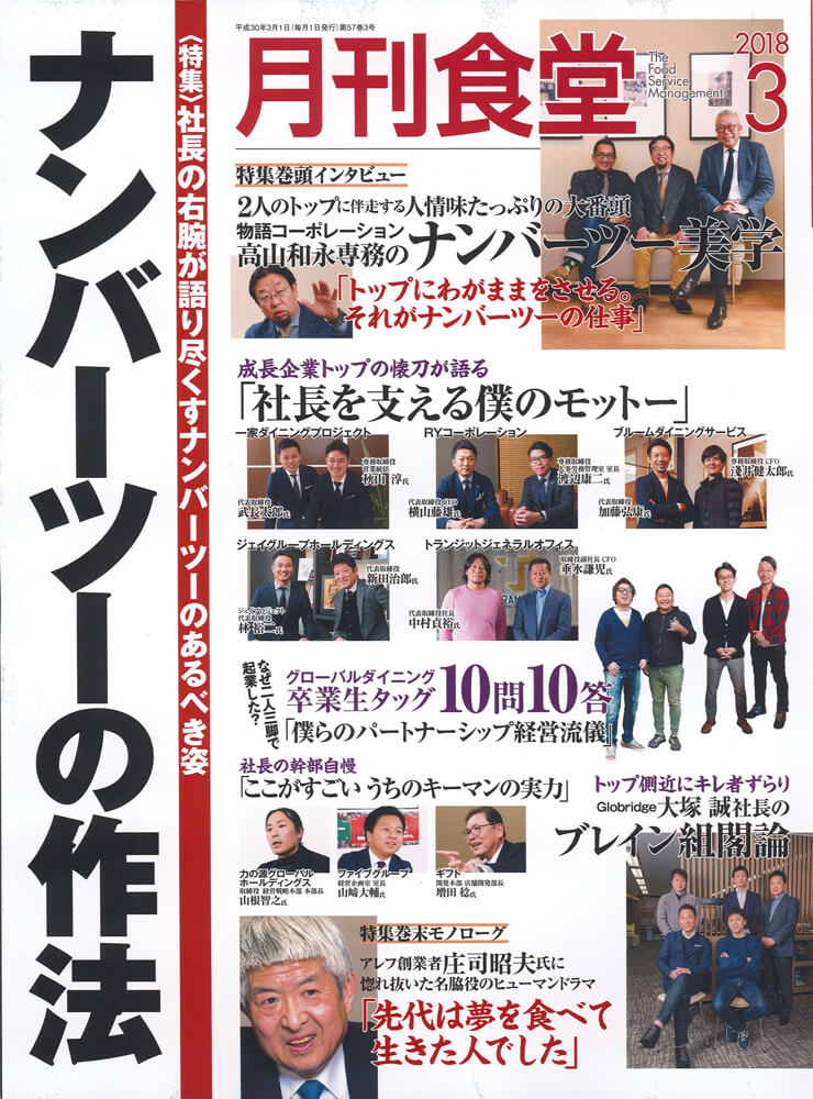 「月刊食堂」3月号に横山社長と渡辺専務のインタビューが掲載されました。 2018年02月26日(月) 2018年3月1日発刊「月刊食堂」3月号に横山社長と渡辺専務のインタビューが掲載されました。 詳しくはこちらから 一覧ページへ戻る