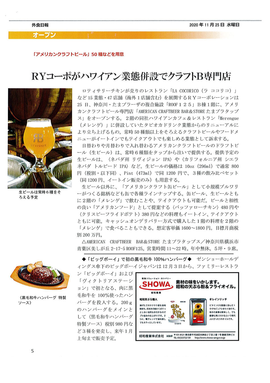 TOP Press Release 2020 2020年12月11日(金) 「外食日報」にたまプラタップスが掲載されました。 2020年12月11日(金) 2020年11月25日発刊「外食日報」にたまプラタップスが掲載されました。 一覧ページへ戻る