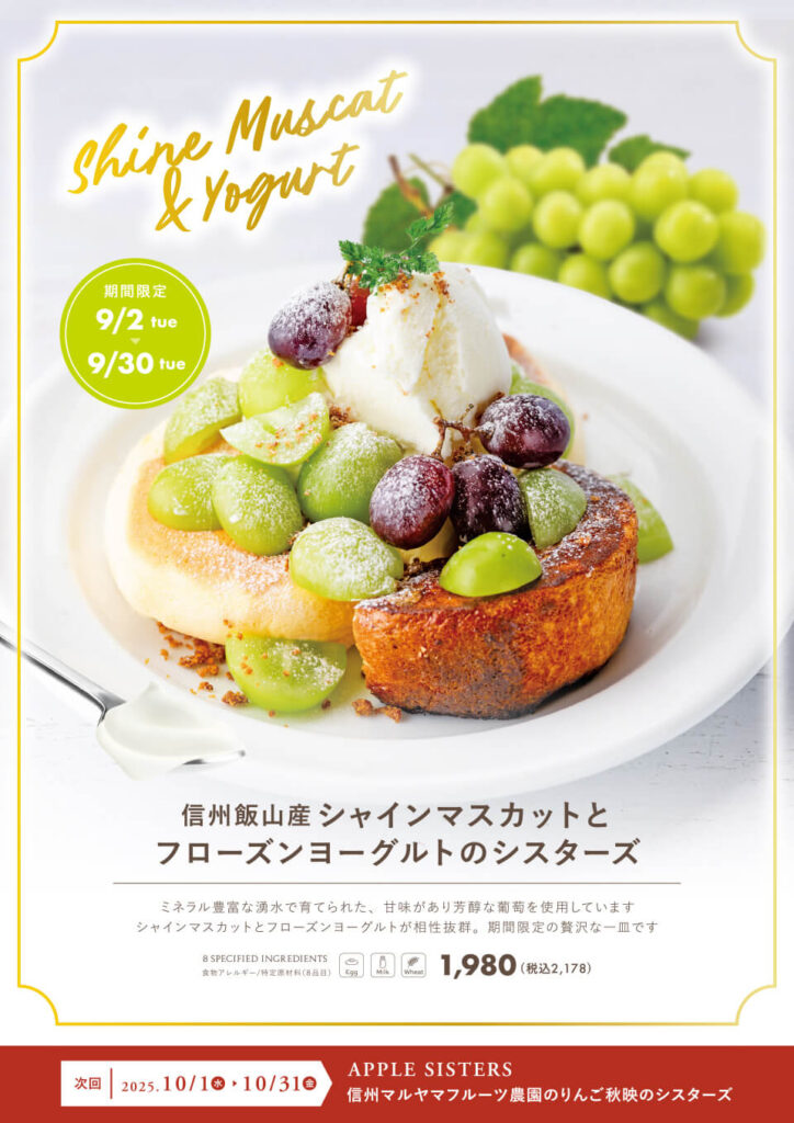 Merengue、The French Toast Factory全店で季節のパンケーキ「シャインマスカットパンケーキ」が始まります。